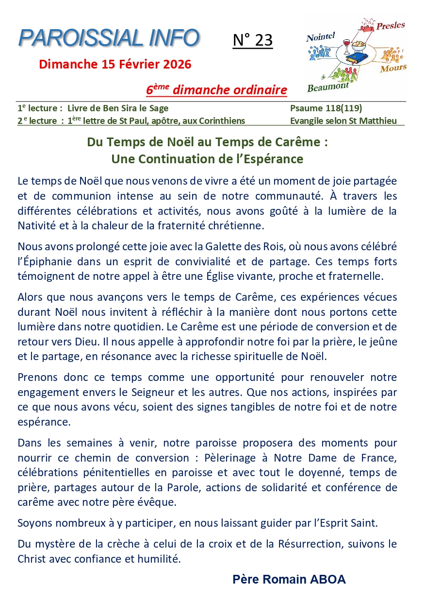 Paroissial Info 23 AccueilParoissial INFOS Dans Paroissial INFOS 17 février 2026 0 9 words 15 février 2026 Paroissial Info n 23 2025- 2026Télécharger Auteur/autrice renenicolasweber@outlook.fr Navigation de l’article Article précédentArticle suivant